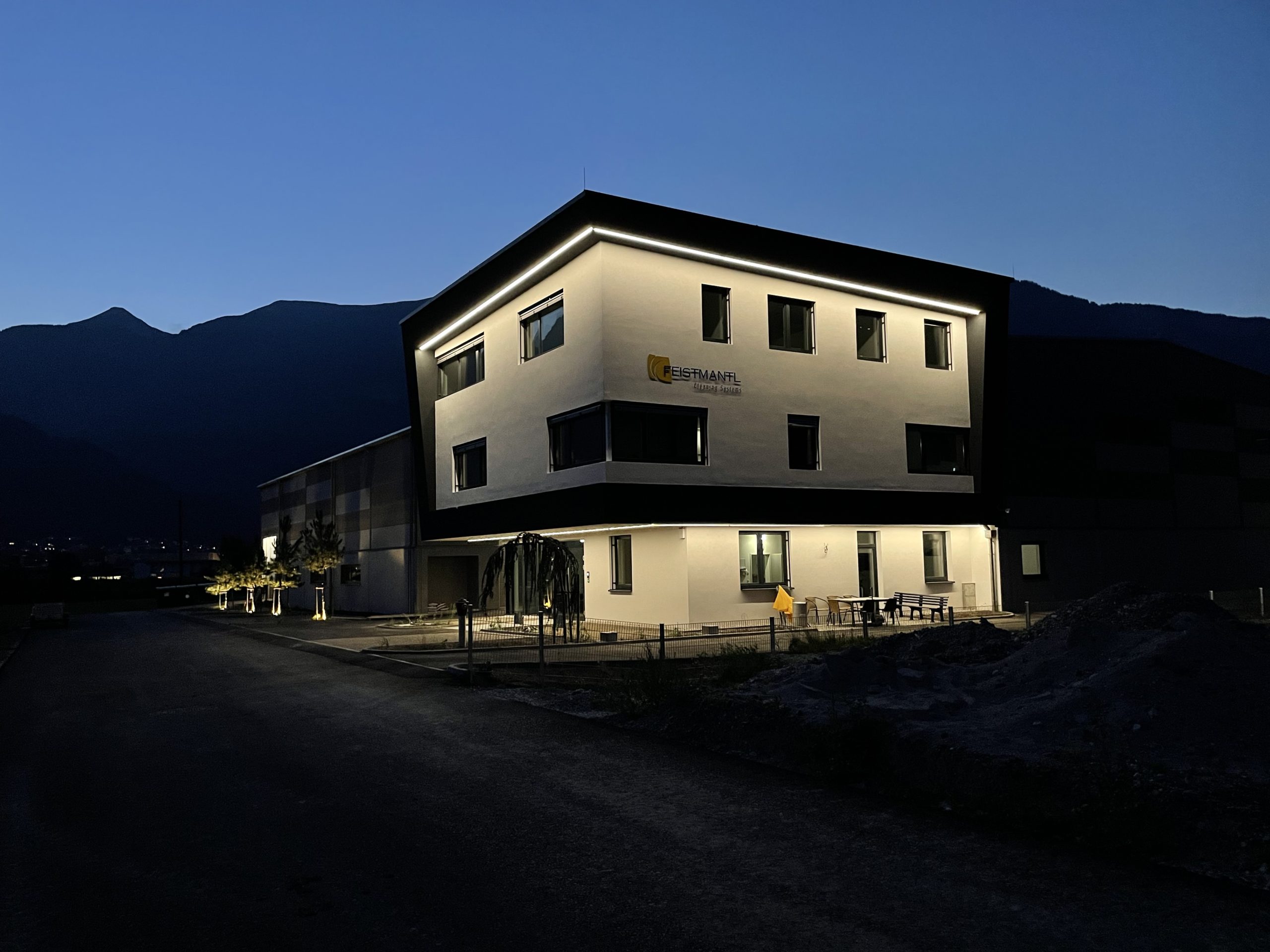 Noch dazu wurden die neuen Raffstore an den Fenstern des Bürogebäudes montiert. Das Highlight ist unsere Beleuchtung die das Firmengebäude am neuen Standort besonders nachts erstrahlen lässt.
